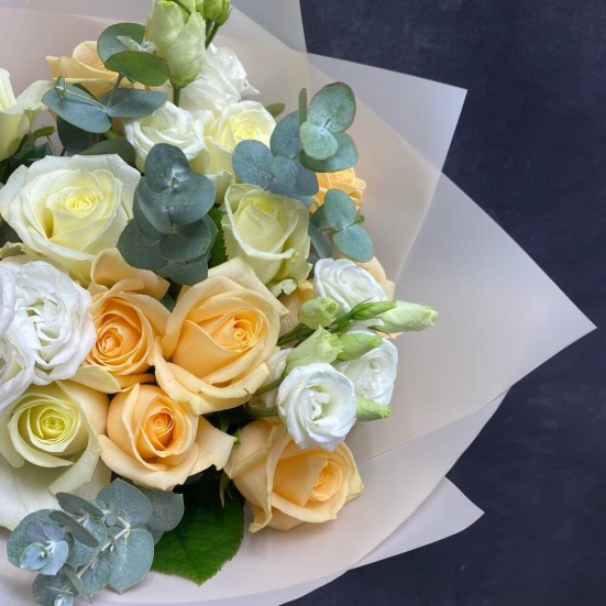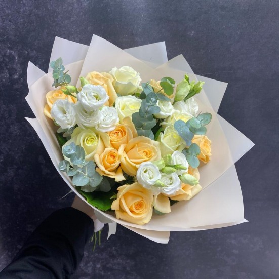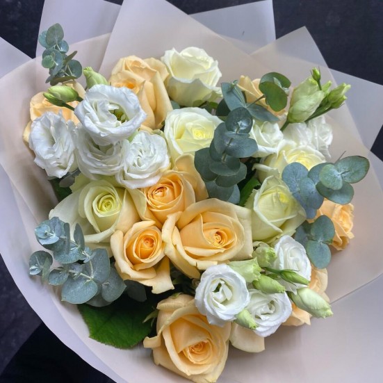 Букет из роз, эустомы и эвкалипта